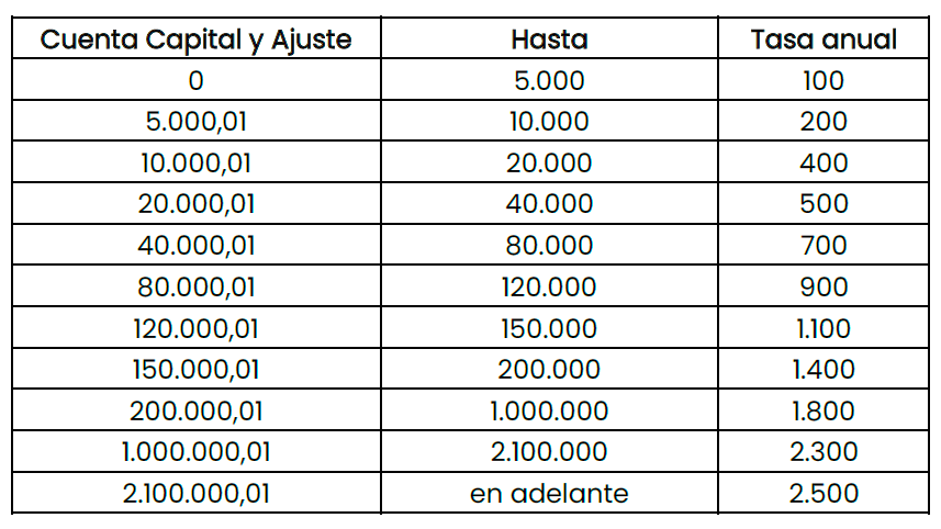El monto de la tasa anual se determinará con relación a su capital social y, a los fines del cálculo, se considerarán los últimos estados contables cuya presentación ante IGJ hubiere correspondido con anterioridad al vencimiento de la tasa, conforme la siguiente escala:
